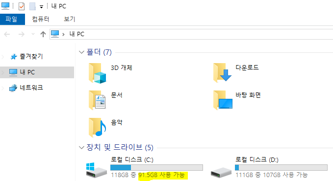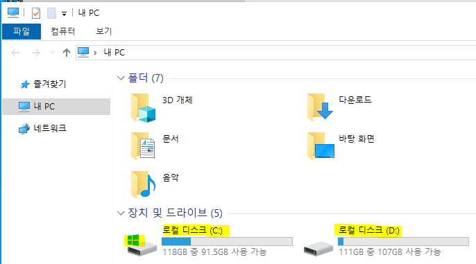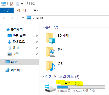 내 PC에 들어가서 보통 C드라이브만 있는 경우에는 내 파일 유지를 한다.