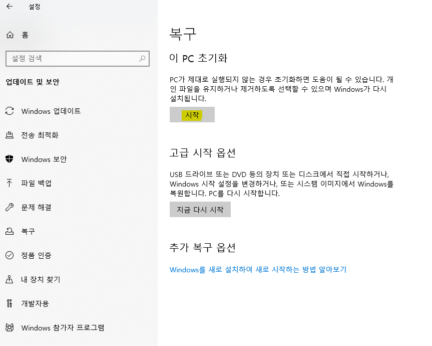 그 후 아래 사진의 '이 PC 초기화' 항목의 '시작'을 누른다.