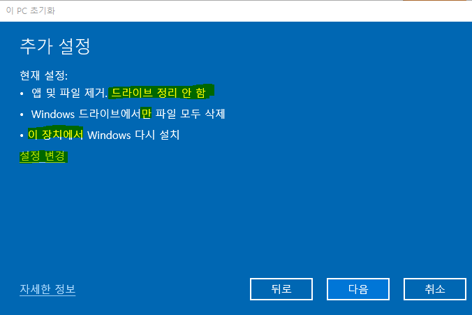윈도우가 깔려있는 C드라이브 뿐만아니라 D,E,F드라이브까지 죄다 포맷되어 버리니 꼭 주의하자.