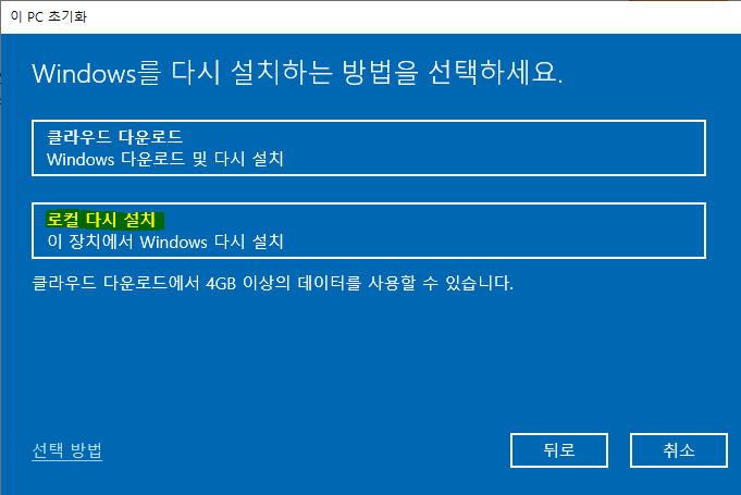 필자는 윈도우10을 애용하고 있으므로 기존 버전 그대로 사용하기 위해 '로컬 다시 설치'를 선택했다.