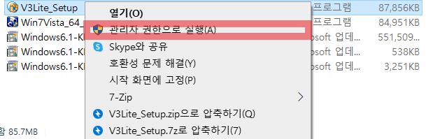 위의 단계에서 V3 Lite 아이콘을 오른쪽 클릭 하면 아래와 같은 메뉴가 나온다.