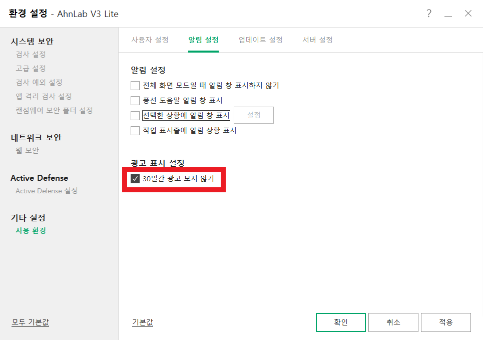 위 사진 처럼 30일간 광고 보지 않기를 체크 후 적용하고 '확인'을 누른다.