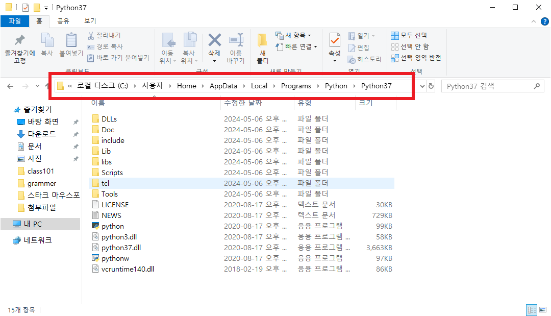 저 경로로 들어가서 윗 부분을 복사하면 그것이 파이썬 설치 경로이다.